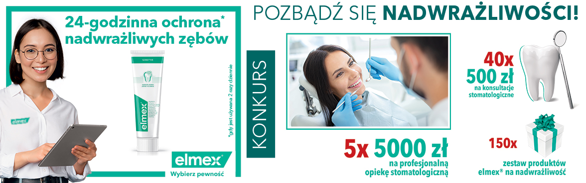 Aby wziąć udział w konkursie należy dokonać zakupu dowolnej pasty elmex® na nadwrażliwość, zachować paragon i udzielić odpowiedzi na pytanie konkursowe:Dlaczego warto walczyć z nadwrażliwością? Wyślij sms* na numer 4321 o treści elmex.numer dowodu zakupu.odpowiedź na pytanie konkursowe.W konkursie można wygrać: